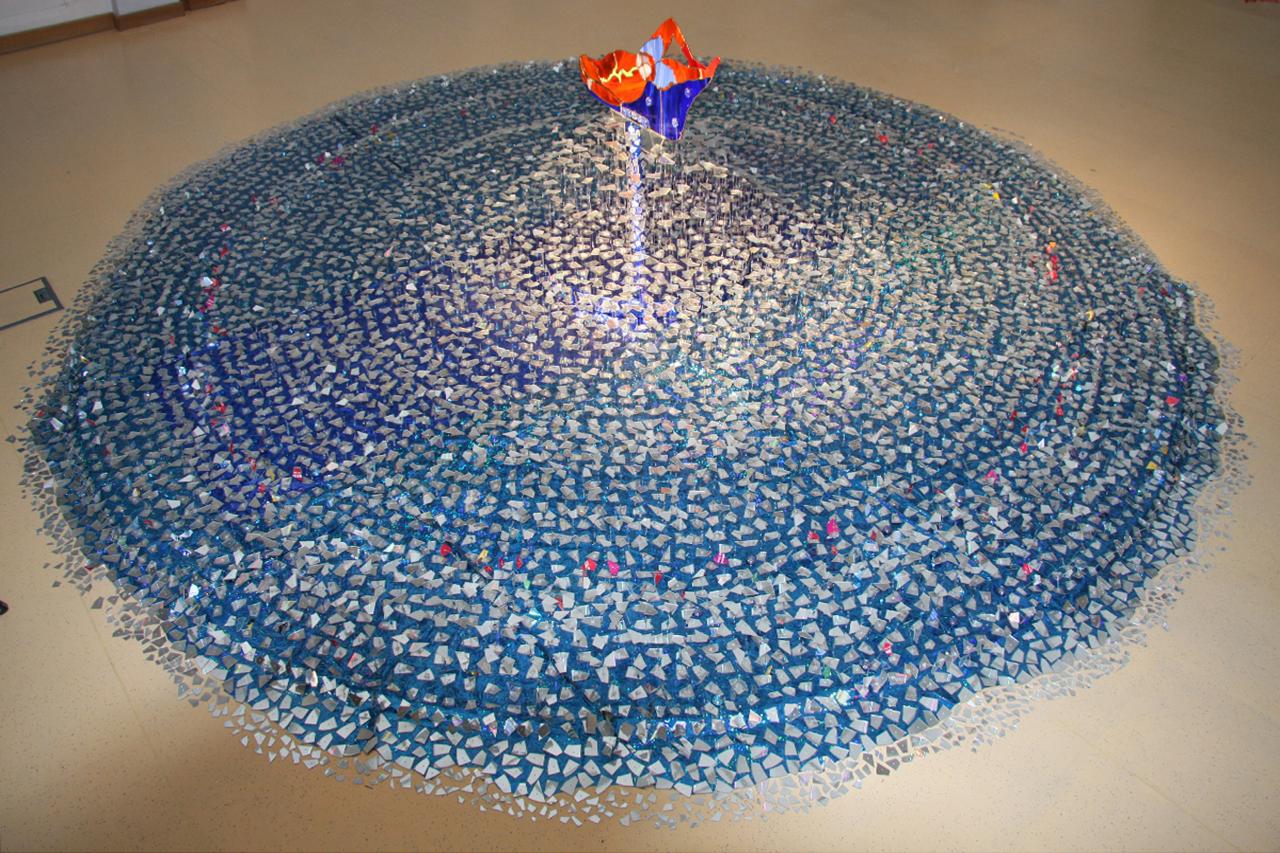 fontaine éclairée de nuit avec ses 2000 bouts de cd et le vitrail en verre Tiffany